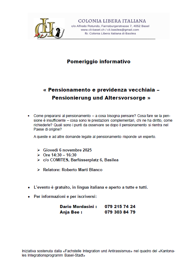 Sabato 8 novembre 2025, dalle ore 14:00 alle 15:30, presso la Colonia Libera Italiana di Lucerna (Sentitreff, Baselstrasse 21, Lucerna),...
