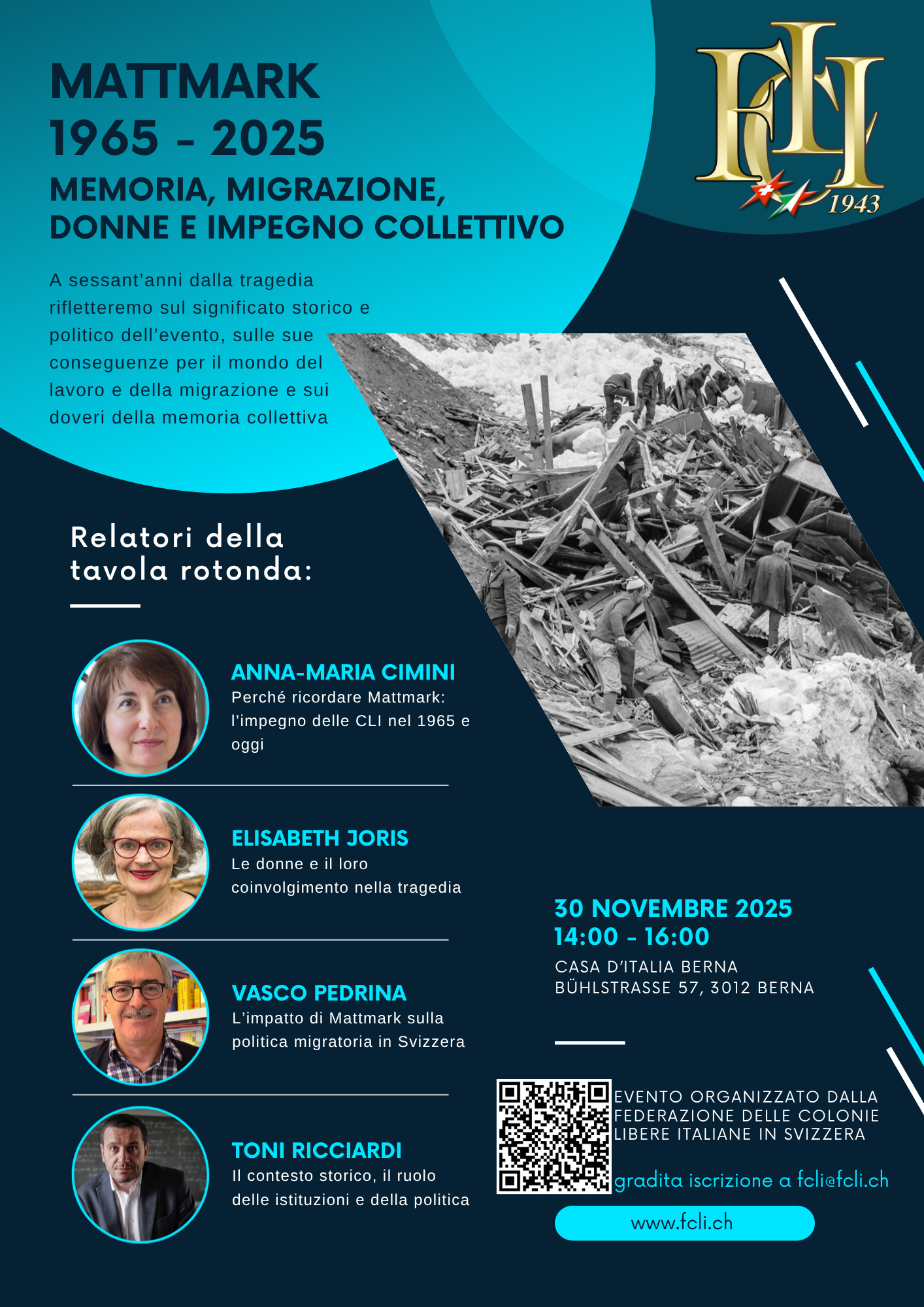 A sessant’anni dalla tragedia di Mattmark, la Federazione delle Colonie Libere Italiane in Svizzera (FCLIS) organizza una tavola rotonda per...