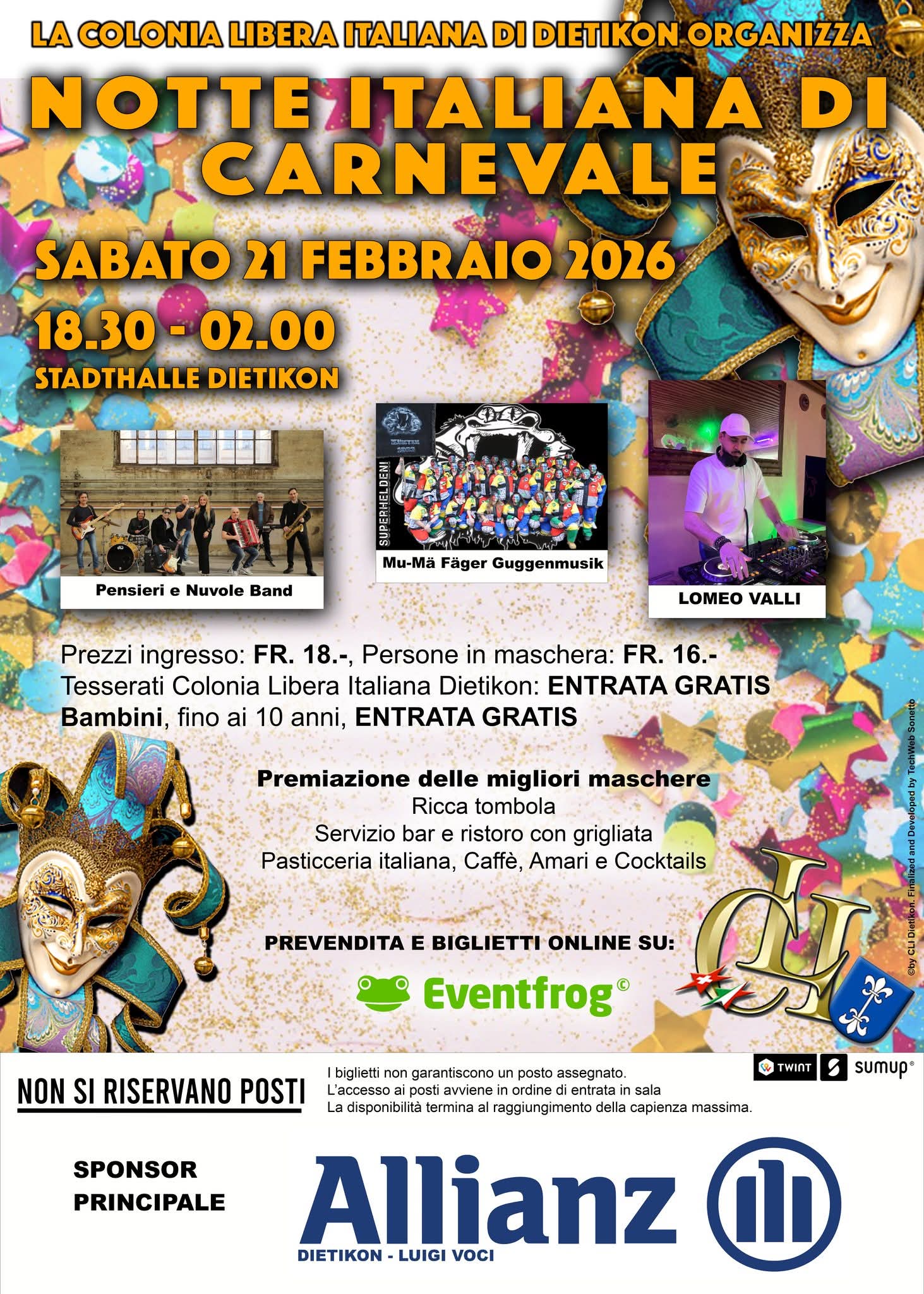 La Colonia Libera Italiana di Horw invitaita soci, amici e simpatizzanti a festeggiare insieme il Carnevale. Venerdì 14 febbraio 2026,...
