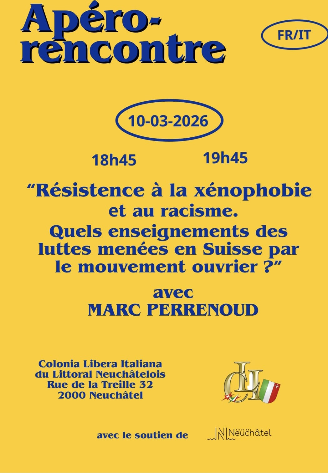 In occasione delle Semaines internazionali contro il razzismo (21 marzo), la Colonia Libera Italiana du Littoral Neuchâtelois organizza un Apéro – rencontre con lo storico Marc Perrenoud dal titolo: «Resistenze alla xenofobia e al razzismo: quali insegnamenti dalle lotte condotte in Svizzera dal movimento operaio?».