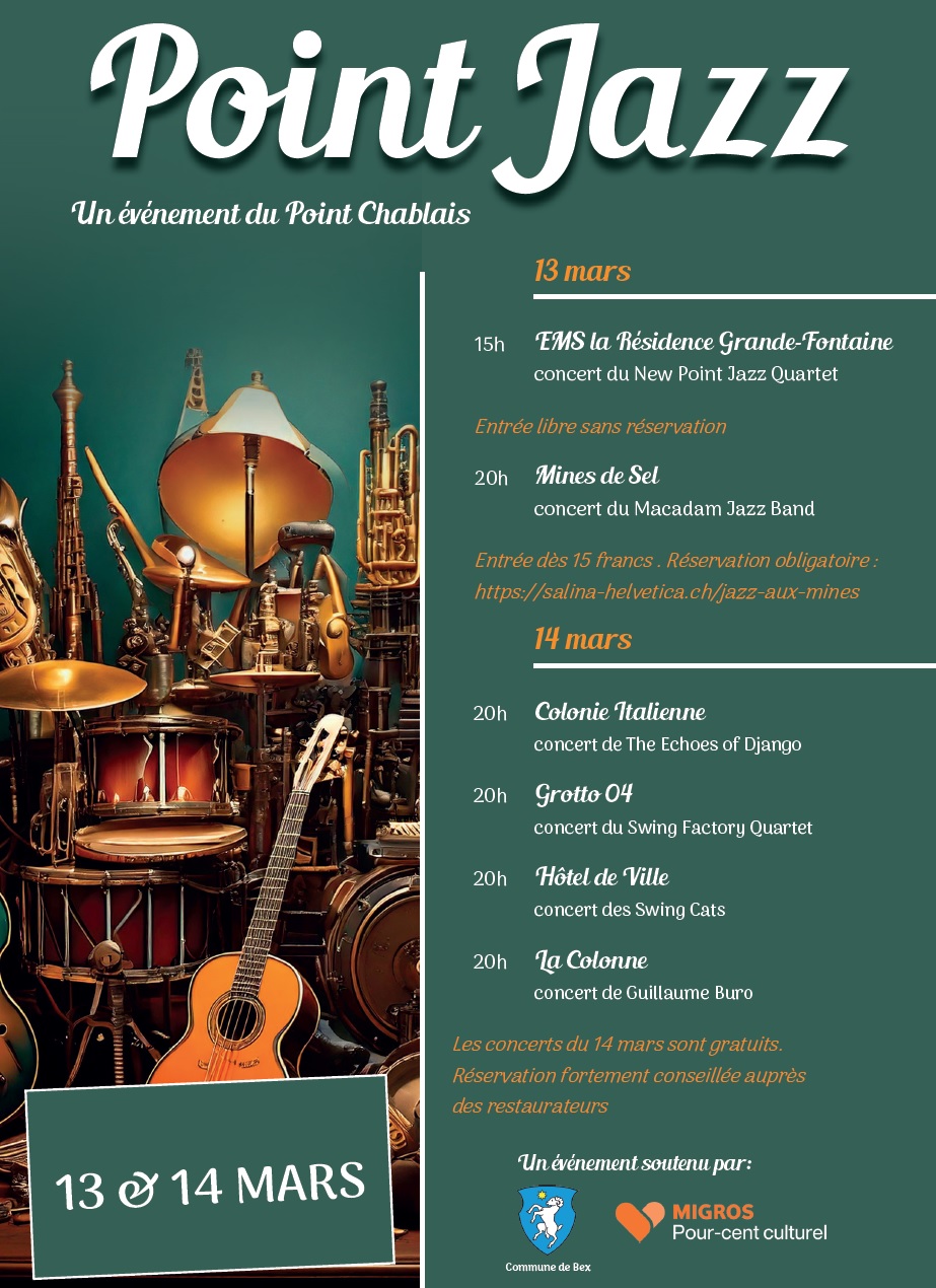 La Colonia Libera Italiana di Bex invita tutti i soci, le socie, gli amici e le amiche della CLI al Point Jazz. L’evento è promosso dal Point Chablais e torna il 13 e 14 marzo con un ricco programma di concerti tra Bex e le suggestive Miniere di Sale. Due giornate dedicate al jazz in diverse sfumature, con appuntamenti pomeridiani e serali in location caratteristiche.