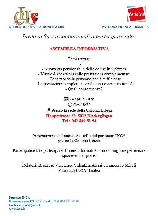 La Colonia Libera Italiana di Niedergösgen-Schönenwerd e il Patronato INCA di Basilea invita tutti i soci e i connazionali a un incontro per fare chiarezza sulle recenti novità del sistema previdenziale svizzero.