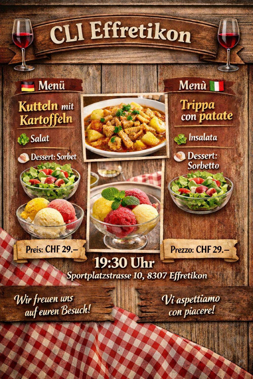 La Colonia Libera Italiana di Effretikon organizza una cena con menu speciale in programma venerdì 27 febbraio 2026, con inizio alle ore 19.30.