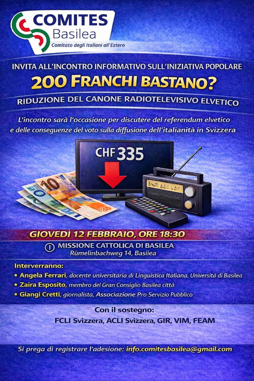 Il COMITES di Basilea organizza un incontro informativo dedicato all’iniziativa popolare svizzera «200 franchi bastano?», che propone la riduzione del canone radiotelevisivo elvetico.