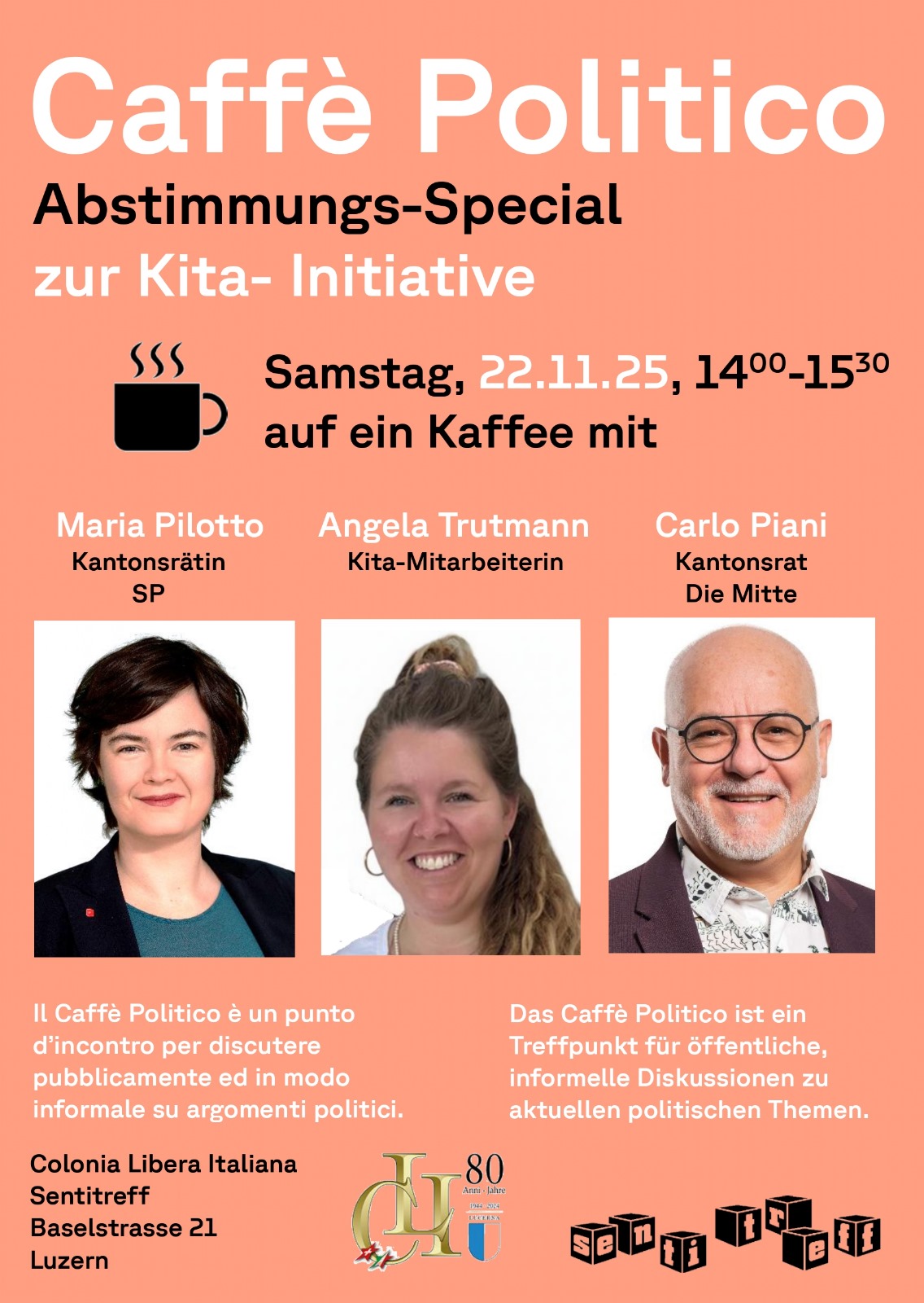 La Colonia Libera Italiana di Lucerna (Sentitreff, Baselstrasse 21, Lucerna), organizza un nuovo appuntamento del Caffè Politico, questa volta dedicato alla Kita-Initiative, tema di grande attualità nel dibattito pubblico svizzero.