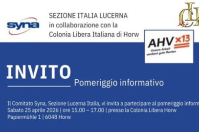 Il Comitato Syna (Sezione Lucerna Italia), in stretta collaborazione con la Colonia Libera Italiana di Horw organizzano un pomeriggio informativo volto a fare chiarezza su temi burocratici e previdenziali di grande attualità. Programma Riforma AVS... Read More