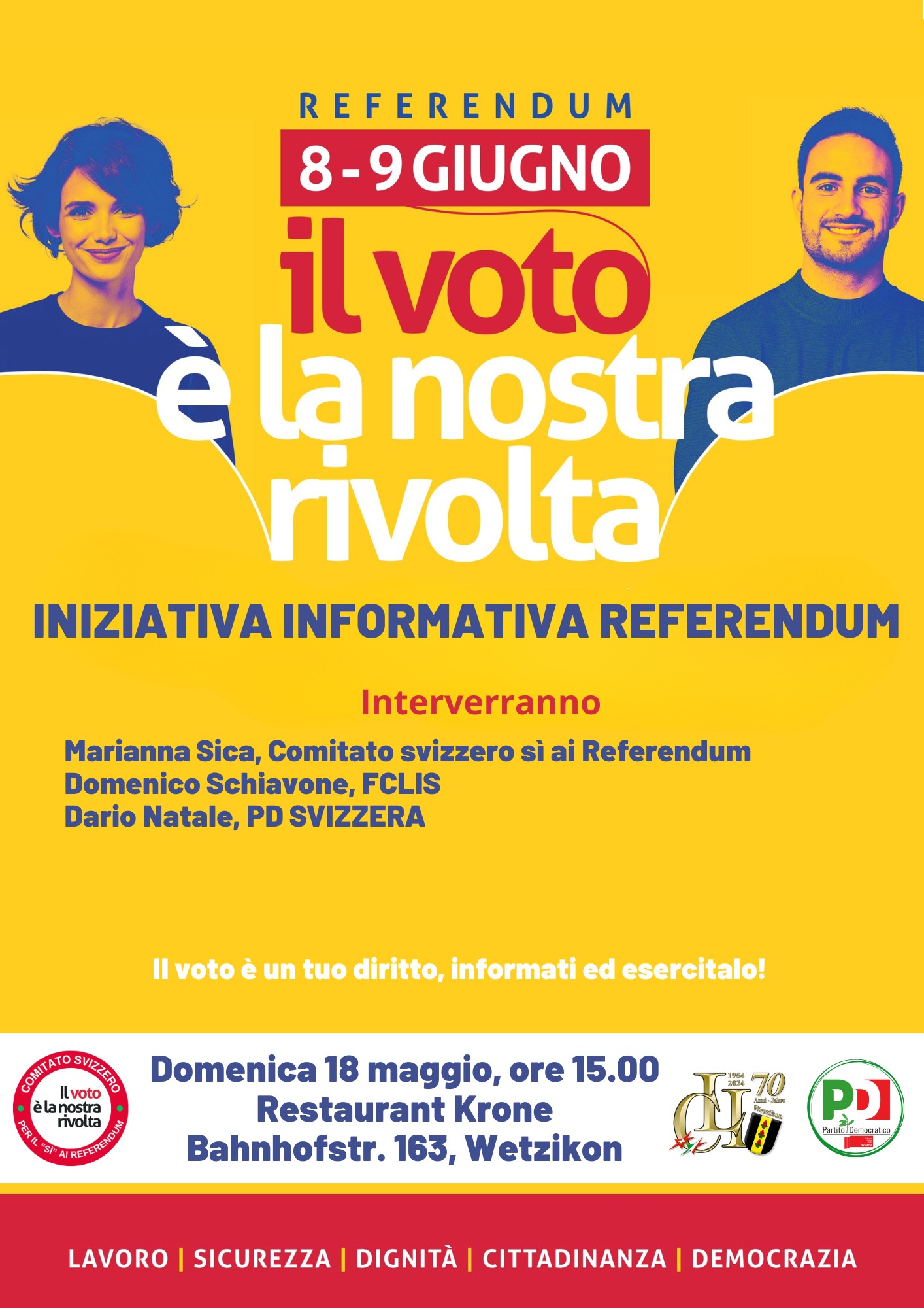 La Colonia Libera Italiana di Wetzikon, in collaborazione con il Comitato Svizzero per il Sì ai Referendum, le ACLI e il Partito Democratico, è lieta di invitarvi a un’importante iniziativa informativa sui referendum del 8-9 giugno.