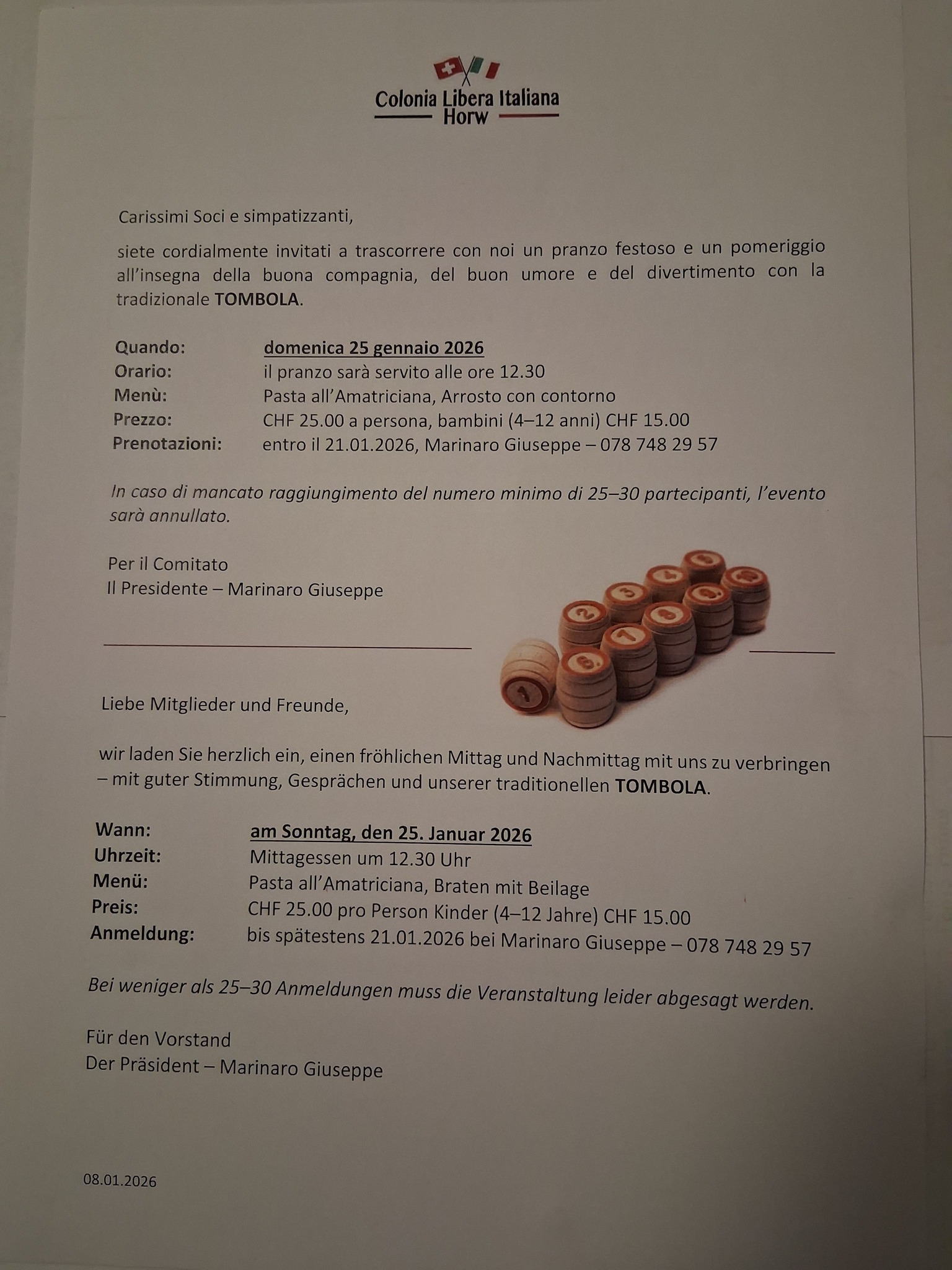 La Colonia Libera Italiana di Horw è lieta di invitare soci, simpatizzanti e amici a trascorrere insieme una giornata all’insegna della convivialità, della buona cucina e del divertimento. Domenica 25 gennaio 2026 vi aspetta un pranzo festoso, seguito da un piacevole pomeriggio in compagnia, arricchito dalla tradizionale e sempre amata Tombola.