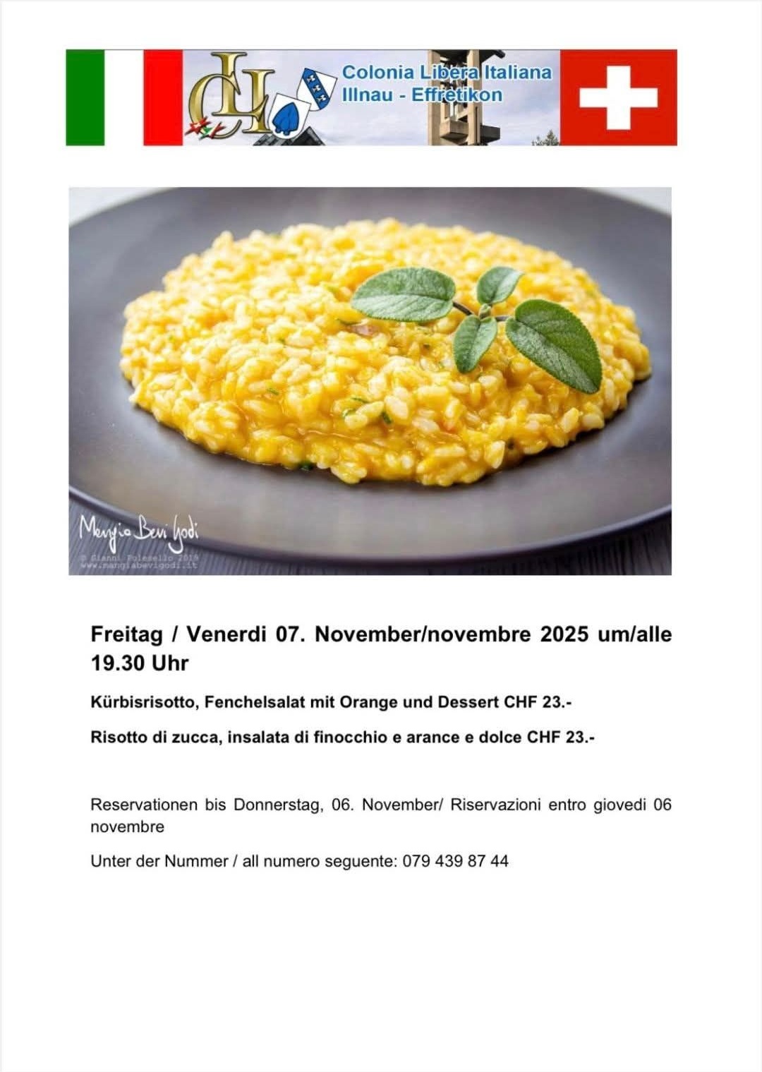 Venerdì 7 novembre 2025, alle 19:30, la Colonia Libera Italiana di Effretikon invita soci, amici e simpatizzanti a una deliziosa serata conviviale all’insegna dei sapori autunnali e della buona compagnia.