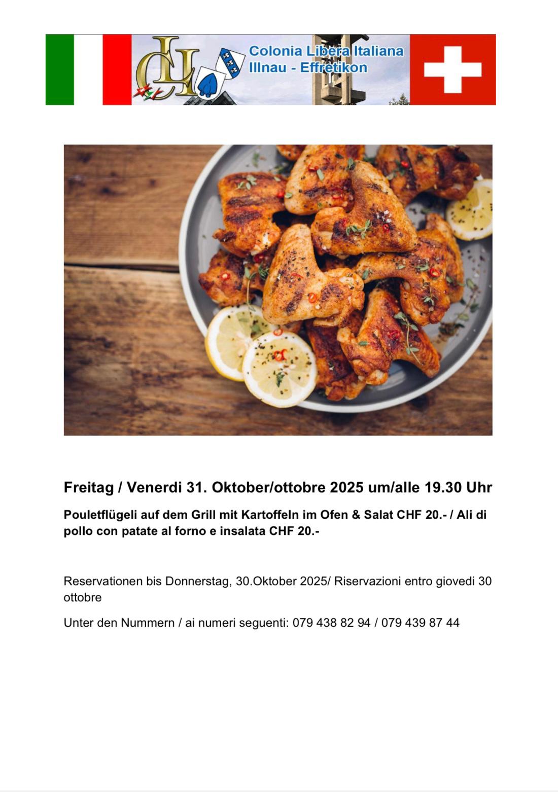 Venerdì 31 ottobre 2025, alle 19:30, la Colonia Libera Italiana di Effretikon invita soci, amici e simpatizzanti a una deliziosa serata conviviale all’insegna del buon cibo e della compagnia.